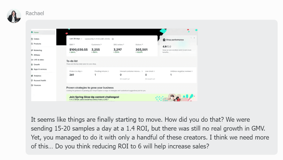 We usually set up a separate Discord/Lark community of creators for the brand once the shop reaches about 70k GMV per month. This helps strengthen creator engagement and scale growth beyond that point.